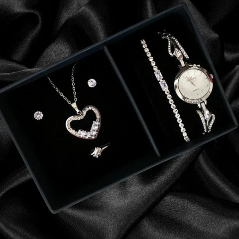 6Pcs Luxury Jewelry Set – Heart Necklace, Watch, Earrings, Ring & Bracelet